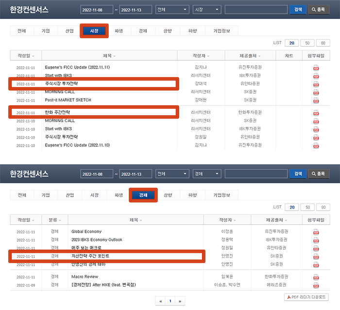 주간 전망 리포트는 한경컨센서스 내에 ‘시장’, ‘경제’ 부분에서 매주 금요일에 확인해 보는 방법이 있습니다.