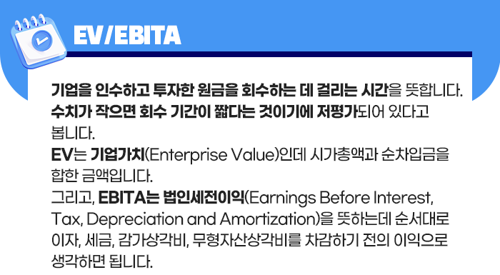 이 실적을 통해 주식의 적정 가치를 추정해 볼 수 있습니다. 바로 주당순이익(EPS), 주가수익비율(PER), 자기자본이익률(ROE), 투자한 원금을 회수하는 데 걸리는 시간을 뜻하는 EV/EBITA 등의 투자지표입니다.