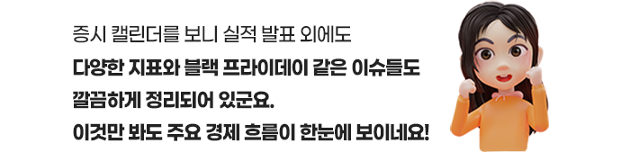 또한, 증시 캘린더를 클릭하면 주요 나라의 경제지표 발표 일정, 국내외 주요 기업들의 실적발표 등과 같은 다음 달의 주요 일정 내용을 볼 수 있습니다. 이를 잘 활용해서 시장의 변화에 대한 준비를 미리 해보시기 바랍니다.