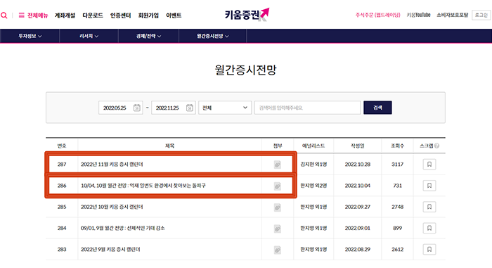 그리고, 증권사별로 매월 말 혹은 월초에 다음 달 전략, 월간 전망의 리포트를 내놓습니다. 아래는 키움증권의 월간 전망입니다. 리서치, 경제/전략 내의 [월간증시전망]에서 확인이 가능합니다.