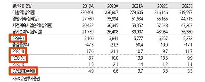 과거 및 미래의 실적은 다음과 같이 확인할 수 있습니다. ‘2021A’와 ‘2022E’에서의 ‘A’는 실제 수치(확정치)라는 의미에서 ‘Actual’을 뜻하고, ‘E’는 추정, 전망치라는 의미에서 ‘Estimate’를 뜻합니다.