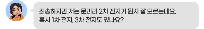 이외에 연료 공급을 하면 전기를 계속해서 생성하는 3차 전지도 있지만, 경제성 등의 이유로 아직 일상생활에서 널리 상용화되지는 못하고 있습니다.