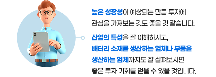 2차 전지는 친환경 에너지로 생산된 전기를 저장하는 에너지 저장 시스템(Energy Storage System)과 휴대폰, 노트북 등의 IT 기계에도 사용됩니다. 하지만, 전기자동차가 대중화되면서 절반 이상이 자동차 분야에 사용되고 있습니다.