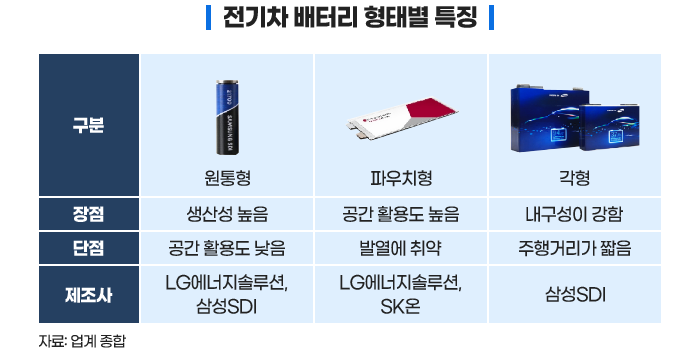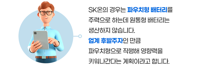 주요 배터리 기업들은 서로 각 사의 전략에 따라 중점을 두고 있는 배터리 유형이 다른데, LG에너지솔루션은 원통형·파우치형 배터리에, 삼성SDI는 원통형·각형 배터리에 집중합니다. SK온은 파우치형 배터리에 힘을 쏟고 있습니다.