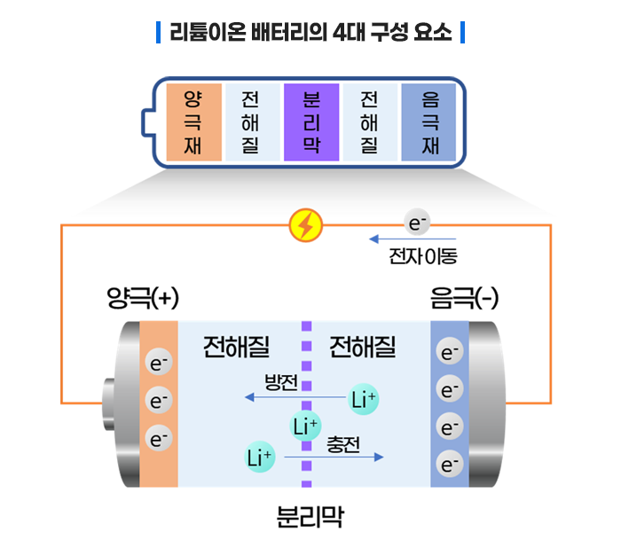 마지막으로 분리막은 양극재와 음극재의 접촉에 따른 폭발을 방지하는 역할로, 이때 리튬이온이 통과할 수 있도록 만들어집니다.