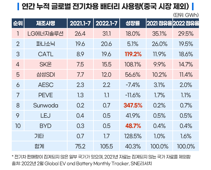 현재 배터리 시장은 우리나라, 중국, 일본이 장악하고 있는 형국입니다. 최근의 통계 자료만 봐도 우리나라 업체들이 준수한 성장을 기록하며 시장 점유율을 넓히고 있습니다.
