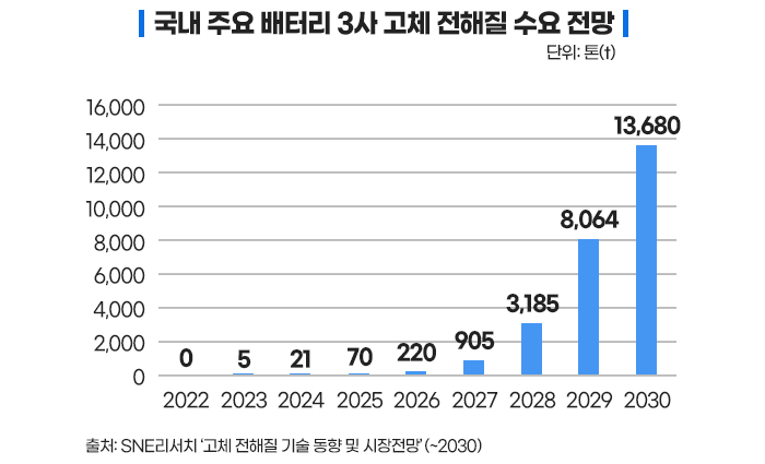 SNE리서치가 추계한 전 세계 배터리용 고체 전해질 수요는 2025년 350톤, 2028년 17,500톤, 2030년 76,000톤으로 매우 가파른 성장세를 보일 것으로 전망되고 있습니다. 그리고 국내 주요 배터리 업체 3사의 경우에는 2025년 70톤, 2030년 13,680톤을 소요할 것으로 전망됩니다.