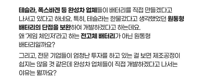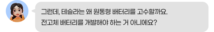 원통형 배터리는 크기가 작은 대신 고용량, 고에너지, 규격화된 사이즈로 생산성과 경제성이 좋습니다. 그래서, 테슬라는 상대적으로 낮은 가격과 수급이 용이한 원통형 배터리를 선택한 것이지요.