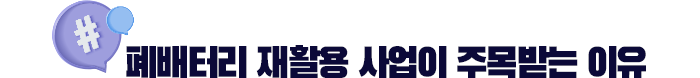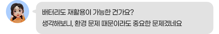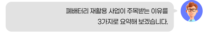 지금까지 배터리 성능 고도화와 동시에 안정성을 확보하기 위한 기술에 대해 주로 말씀드렸는데요. 기술 경쟁 이슈 외에, 현재 새롭게 주목받고 있는 폐배터리 재활용 사업에 대해서도 설명을 드려보겠습니다.
