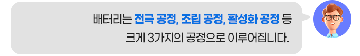 조립 공정: 제조된 극판에 전해액, 분리막 등 각종 소재들과 조립