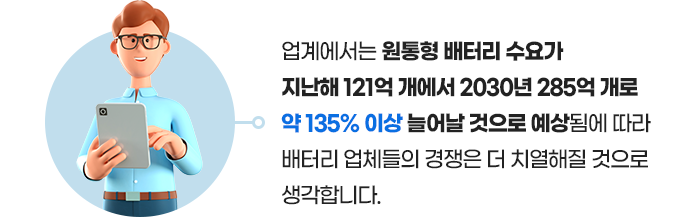 하지만 테슬라가 2020년 4680 원통형 배터리 개발 계획을 발표한 이후 각형과 파우치형으로 기울던 배터리 시장의 판도가 원통형 중심으로 되돌아오고 있는 상황입니다.