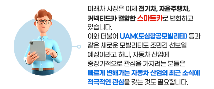 또한, 스마트카는 통신 시스템과 연결되고, 스스로 인지·판단·제어하며, 운전 외에도 다양한 콘텐츠를 즐길 수 있는 공간, 즉 바퀴 달린 IT 기기로 진화 중인데요.
