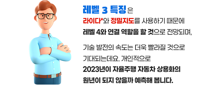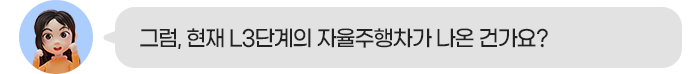 자율주행 L3는 이른바 조건부 자율주행으로, 자율주행 시스템이 기본적으로 주행을 하되 돌발 상황이 발생한 때만 운전자가 개입을 하게 됩니다. 즉, 운전 주체가 사람에서 시스템으로 넘어가는 L2 수준 대비 진정한 의미의 자율주행에 가깝다고 볼 수 있는 것입니다.
