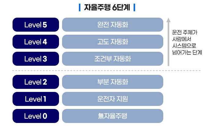 자율주행차 기술의 척도로는 미국자동차공학회에서 제공한 ‘Levels of Driving Automation(자율주행 기술 단계)이 있는데요. 자율주행 기술 단계는 L0 ‘無 자율주행’, L1 ‘운전자 지원’, L2 ‘부분 자동화’, L3 ‘조건부 자동화’, L4 ‘고도 자동화’, L5 ‘완전 자동화’까지 총 6단계로 구분됩니다.