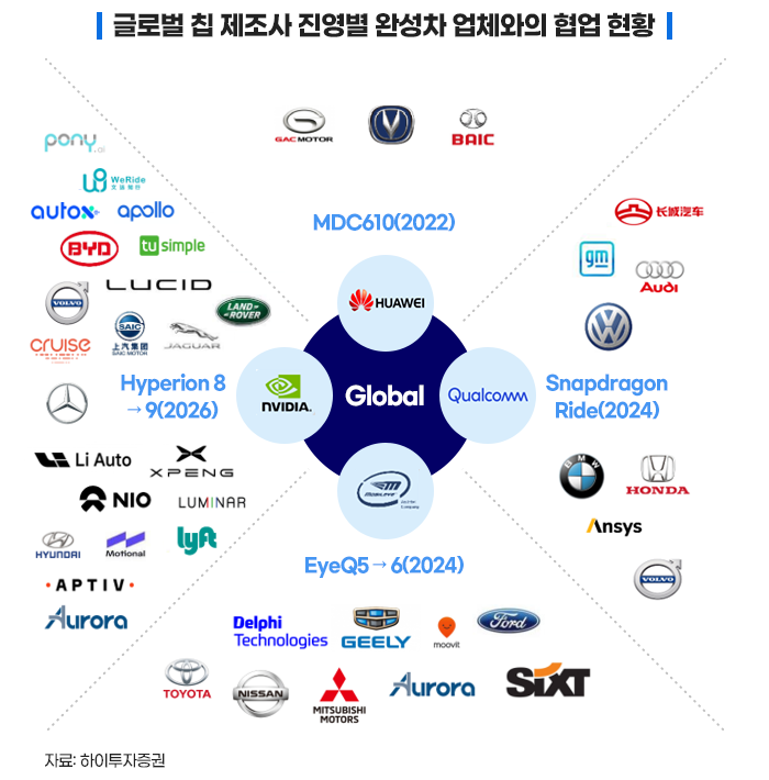대표적인 협력 관계로 반도체 칩 제조사가 제공하는 통합 플랫폼(소프트웨어, 자율주행칩)을 채택하고 있는 것을 들 수 있는데요. 상위 30개 완성차 업체 중 20개 업체가 nVIDIA 플랫폼을 채택하고 있으며, Qua lcomm, Mobileye 등이 nVIDIA의 아성에 도전하고 있습니다.