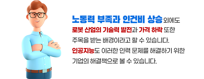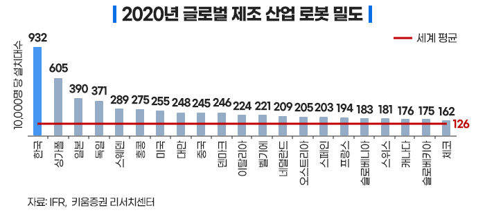 기존 로봇 시장은 노동 비용이 많이 들고, 자본력이 큰 선진국들을 중심으로 산업용 로봇 위주의 성장을 해왔습니다. 우리나라도 적극적으로 산업용 로봇을 도입하여 2020년에는 세계 로봇 밀도에서 1위를 차지할 정도였습니다.