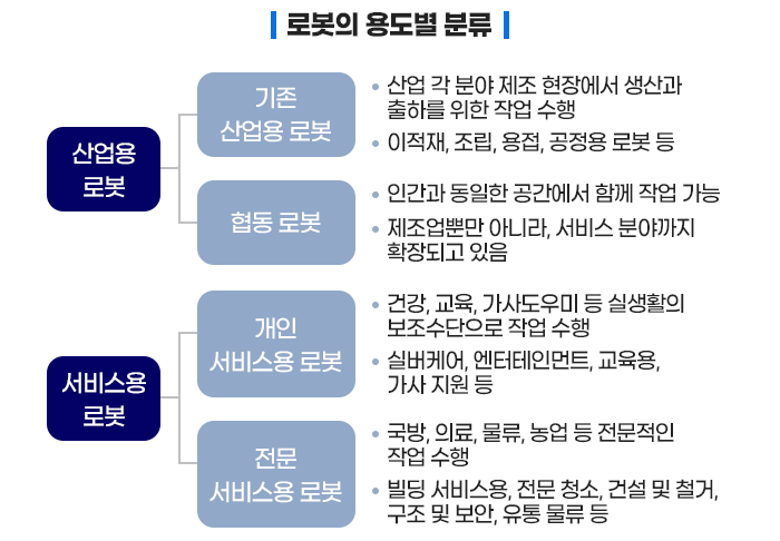 요즘 주목을 받고 있는 서비스용 로봇도 용도에 따라 개인 서비스용과 전문 서비스용 로봇으로 구분이 되는데요. 개인 서비스용은 주로 청소, 취미, 가사용 로봇이고, 전문 서비스용은 의료, 물류, 국방, 농업 등 전문적인 분야에서 활용되는 로봇입니다.