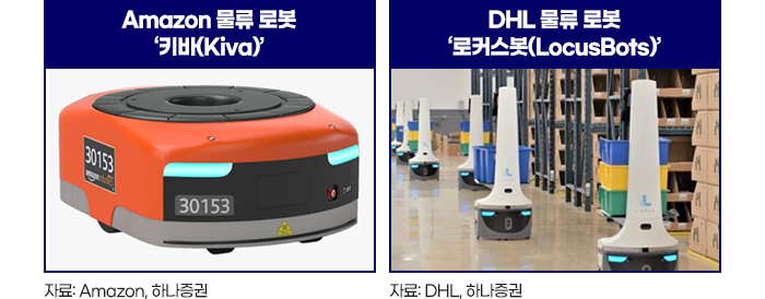 산업 현장에서는 지게차와 같이 적재된 물품을 작업 위치로 이동시킬 수 있는 아마존의 키바(Kiva), DHL의 에피봇(EFFiBot) 등이 있고, 작업자가 편하게 피킹 및 물품을 전달할 수 있는 DHL의 로커스봇(LocusB ots)과 같은 물류 로봇이 있습니다.