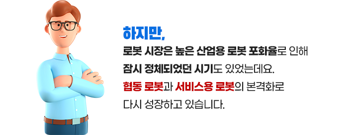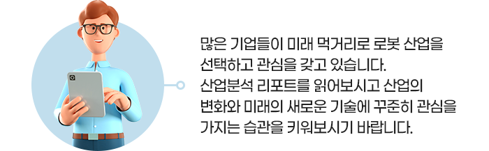 기존 로봇 산업을 선점하였던 선진국 위주의 시장 구조가 협동 로봇, 서비스용 로봇으로 관심이 주목되며 새로운 시장이 열리고 있는데요. 우리나라 기업들이 이런 기회를 놓치지 않고 새로운 로봇 시장의 강자가 되기를 기원합니다.
