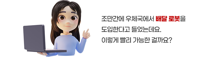 네. 맞습니다. 우정사업본부는 2025년부터 로봇을 활용해 편지와 고지서, 소포 배달을 시작한다고 발표를 했는데요. 우편물을 실은 자율주행차가 아파트 단지에 도착하면 집배원이 아파트 내 소포 보관함으로 우편물을 나르고 배달 로봇이 각 가구의 문 앞으로 우편물을 배송한다고 합니다.