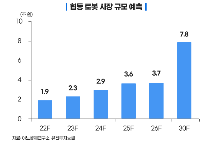 인간과 협력하여 더욱 정밀하고 다양한 작업이 가능한 협동 로봇의 수요는 엄청난 성장이 기대되며, 203 0년에는 8조 원 가까이 성장할 것으로 예측됩니다.