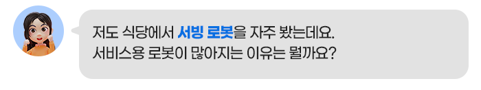 사실, 이제 우리 주변에서도 심심치 않게 로봇들을 볼 수 있는데요. 식당에서도 직원이 주문을 받는 대신 키오스크로 주문과 결제까지 대신하는 곳도 많아지고, 음식을 가져다주는 서빙 로봇도 많이 보입니다. 무인 매장으로 운영되는 로봇 카페도 등장했다고 할 정도로 서비스 분야에서 로봇의 도입이 활발하게 이루어지고 있습니다.