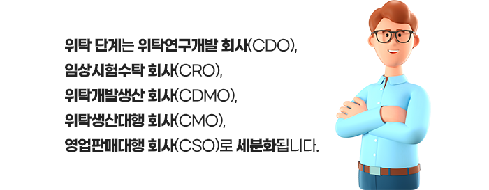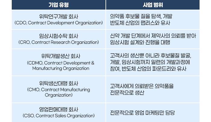 반도체 사업이 설계를 전문으로 하는 팹리스와 위탁생산을 전문으로 하는 파운드리, 설계부터 생산, 판매까지 하는 종합반도체기업(IDM)으로 크게 나뉘듯, 제약·바이오 산업도 다음과 같이 분류될 수 있는데요.