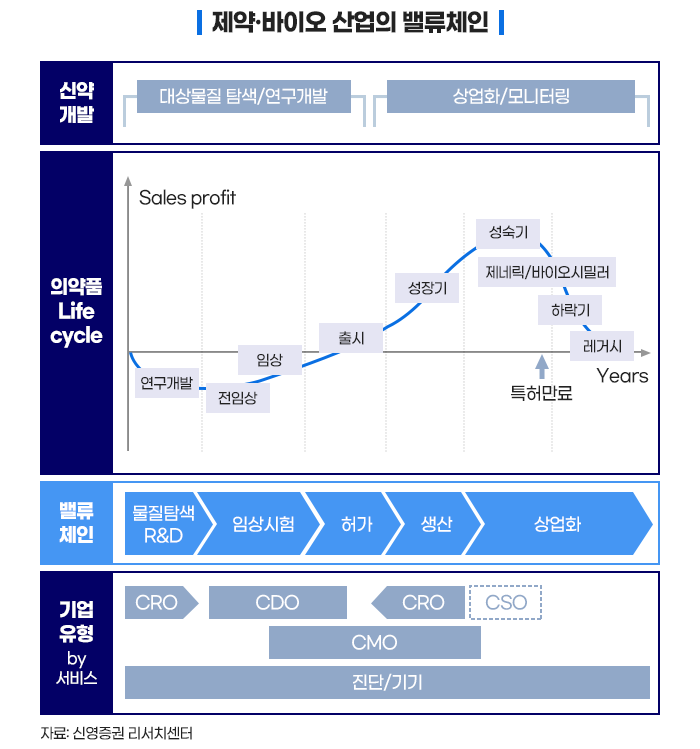 제약·바이오 산업은 연구·개발–임상시험–허가–생산–상업화(판매)의