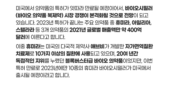 의약품 특허 만료는 오리지널 제약사에는 위기지만, 바이오시밀러 회사에는 기회일 수 있습니다. 특히, 바이오시밀러는 오리지널 바이오 의약품의 효능은 유지하면서 적은 비용으로 비교적 짧은 시간 내에 개발이 가능해서 의약품의 가격 부담을 줄일 수 있기 때문에 세계 각국의 수요도 계속해서 확대되는 추세입니다.