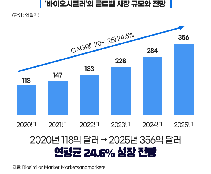 글로벌 바이오시밀러 시장은 2025년 약 356억 달러 규모로 성장할 것으로 예측되는데요. 고령화 추세, 만성질환 증가 등으로 전문의약품의 수요는 앞으로도 견조할 것으로 예상됩니다. 게다가 주요 오리지널 바이오 의약품의 특허도 연이어 만료될 예정이라 바이오시밀러 시장은 더욱 활성화될 것으로 전망됩니다.