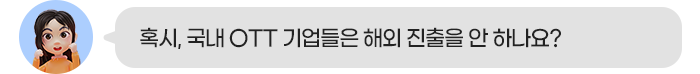 그건 아닙니다. 현재 한국 OTT 업체들도 글로벌 시장에 진출해 입지를 강화하고 있습니다. SK텔레콤과 지상파 3사의 합작으로 2019년에 서비스를 시작한 웨이브는 2022년에 북중남미 30개국 이상에서 K-콘텐츠를 제공하고 있는 코코와(KOCOWA)를 인수하고 글로벌 진출을 본격화하였습니다.