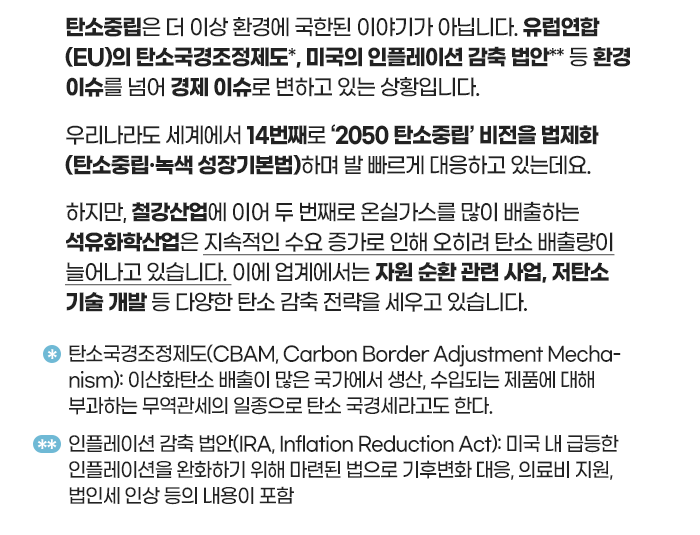 또한, 탄소 포집·활용·저장 기술, 폐플라스틱·폐비닐 재활용 기술 개발을 통해 탄소배출 최소화를 추진하고 있는데요.