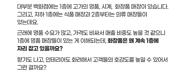 화장품 매장이 백화점 1층에 입점하기 시작한 것은 1990년대부터였습니다. 이는 경제성장과 함께 외국 화장품이 유입되면서 미국, 일본 등 선진국에서 발전한 백화점 문화를 참고한 것입니다.