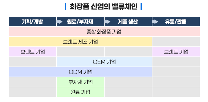 화장품 산업의 밸류체인에는 크게 브랜드 기업(브랜드 기업/브랜드 제조 기업/종합 화장품 기업), 제조기업(OEM/ODM), 부자재 기업, 원료 기업 등이 있습니다.