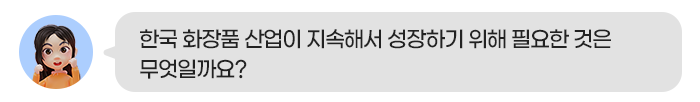 이렇게 다양한 장점이 있는 화장품 산업은 한류 열풍과 함께 중국, 동남아를 넘어 미국과 일본 등에서도 지속적인 성장을 하고 있는데요. 화장품 산업은 성장 잠재력이 큰 고부가가치 산업으로 국내 기업들은 내수 사업 역량을 바탕으로 글로벌 시장을 공략하고 있습니다.