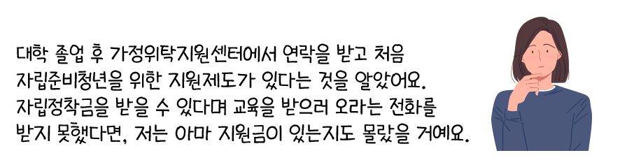 이 같은 경우는 생각보다 많습니다. 자립준비청년은 크게 아동양육시설(보육원, 그룹홈 등)에서 자란 경우와 가정위탁(위탁가정)에서 자란 경우로 나뉘는데, 특히 가정위탁 출신 자립준비청년들은 시설과 달리 단체생활을 하지 않아서 자신이 지원받을 수 있는지 모르는 경우가 정말 많거든요.