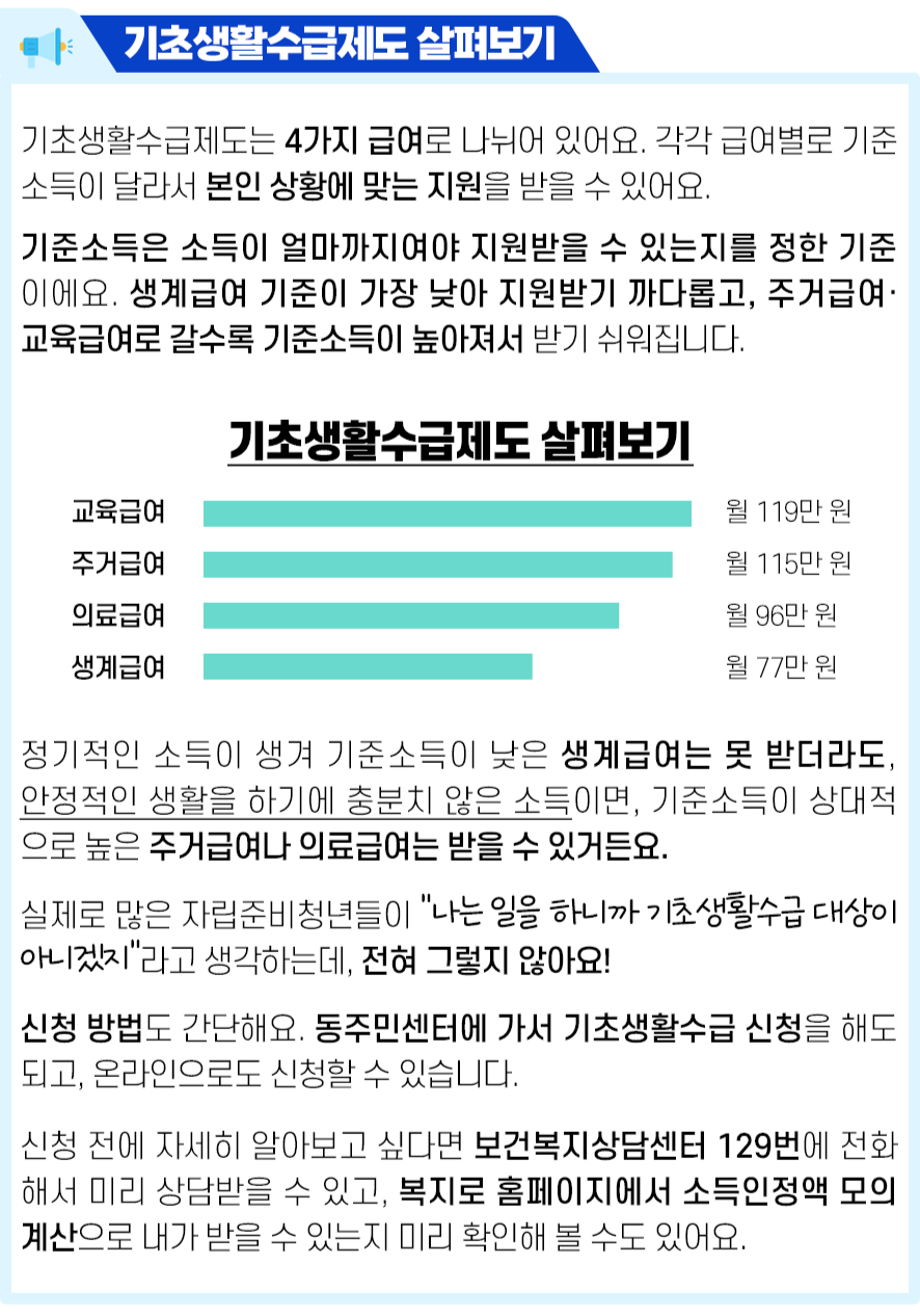 '복지로' 홈페이지(www.bokjiro.go.kr)는 물론이고, 주민센터나 자립지원전담기관, 시군구 홈페이지 등도 한 번씩 들러보세요.