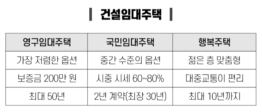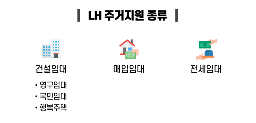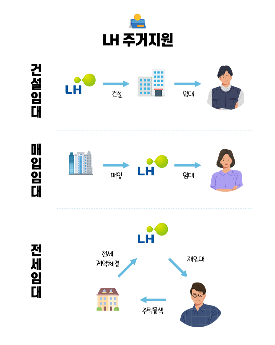 첫 번째는 건설임대주택이에요. LH가 처음부터 새로 지어서 임대하는 아파트거든요. 영구임대, 국민임대, 행복주택 같은 게 여기에 해당해요.