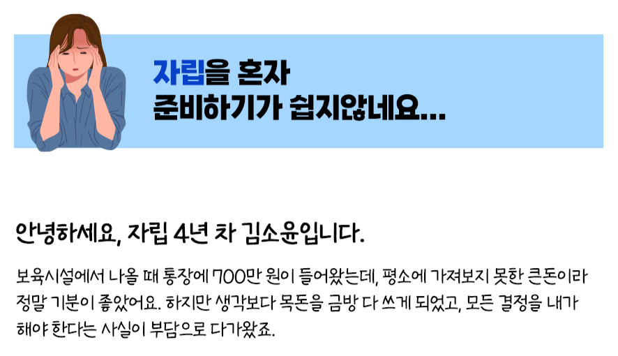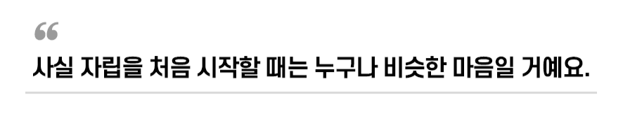 자립 하던 때 김소윤 씨가 느꼈던 그 설렘과 동시에 밀려온 막막함, 여러분도 비슷하게 느끼고 계실 거예요. 하지만 이제는 다릅니다. 여러분은 혼자가 아니에요.