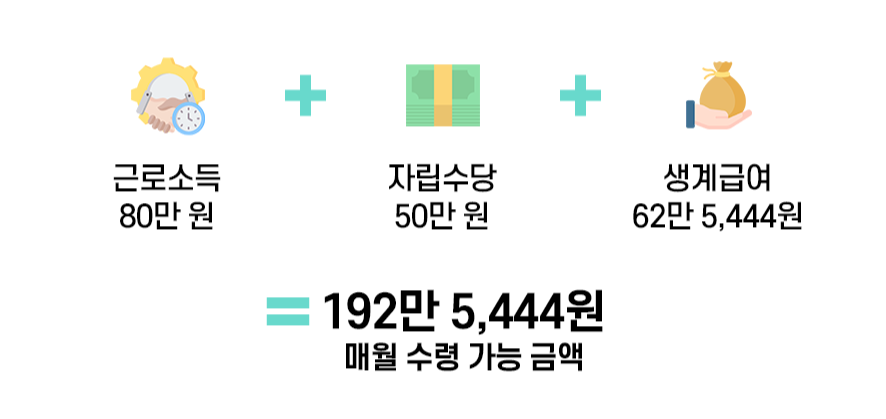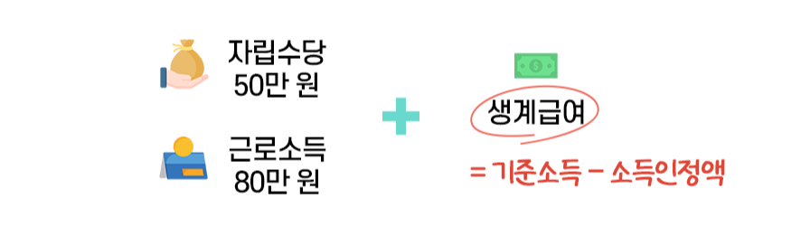 편의점 아르바이트를 해서 80만 원 소득이 있다면 월 소득이 어떻게 될까요? 자립수당 50만 원과 함께 근로소득 80만 원이 생깁니다. 하지만 이 경우에도 생계급여를 신청해서 받을 수 있어요.