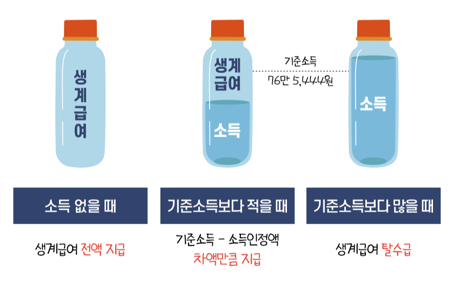 소득이 월 169만 원을 초과하지 않는다면 본인의 인정소득액과 기준 76만 5,444원의 차액을 생계급여로 받을 수 있습니다.