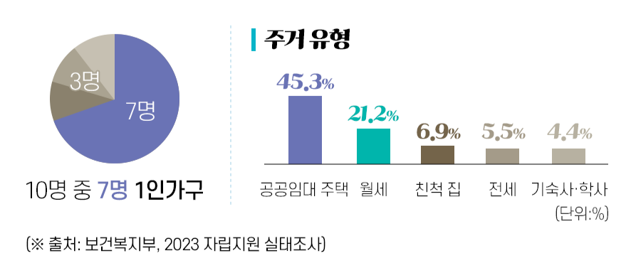 자립준비청년 중 45.3%는 공공임대에 살고 있지만, 18% 이상은 고시원, 친구 집, 월세 원룸에서 불안정한 주거 상황을 이어가고 있어요. (보건복지부, 2023 자립지원 실태조사)