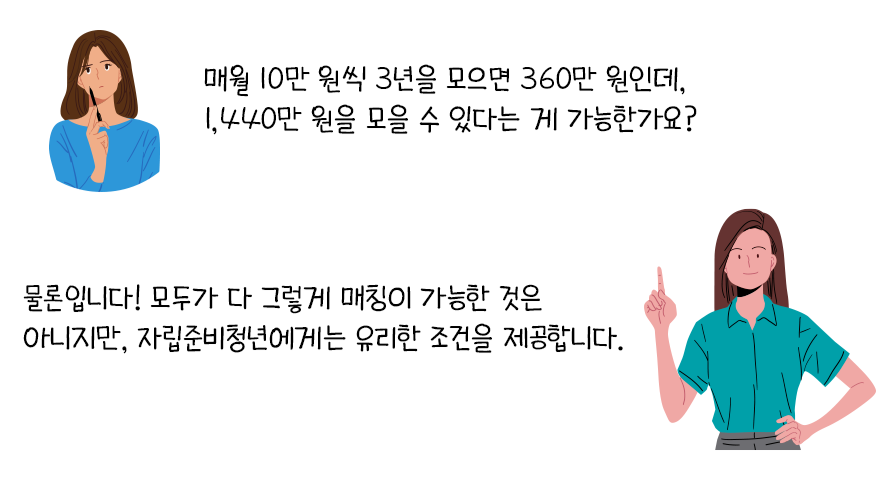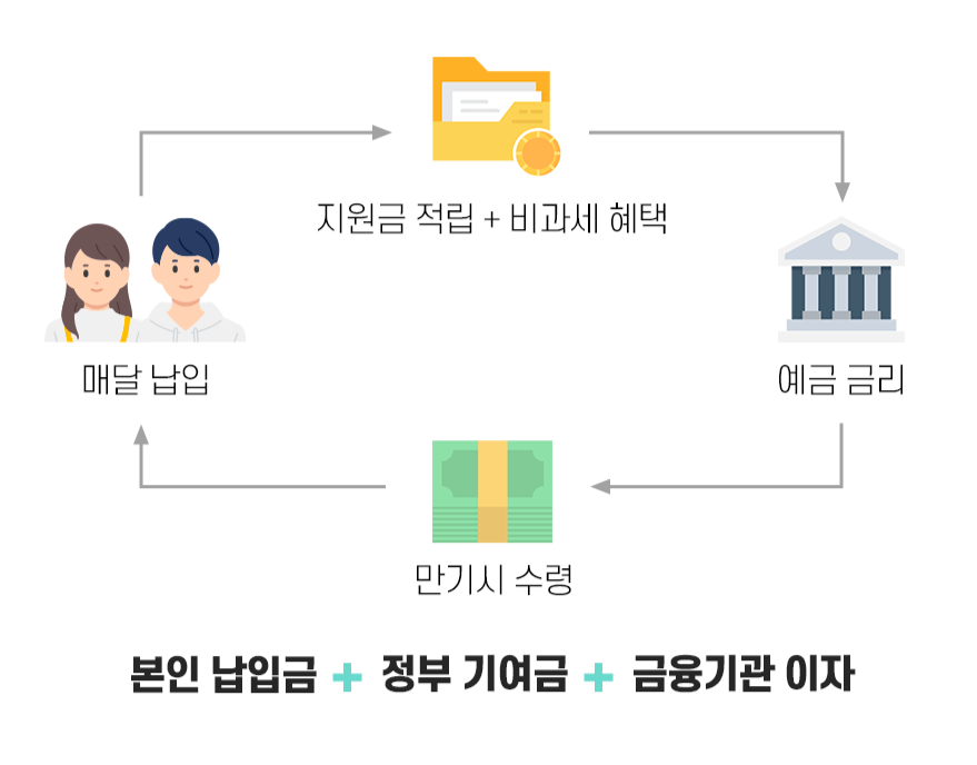 그래서 정부에서 "저축 습관도 기르고, 목돈도 마련할 수 있도록" 특별히 더 많은 지원을 해줍니다.