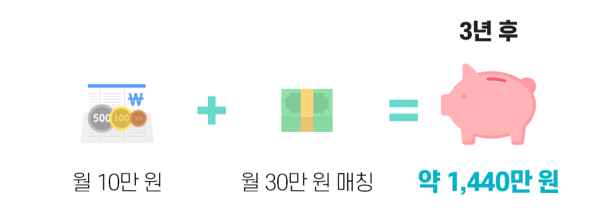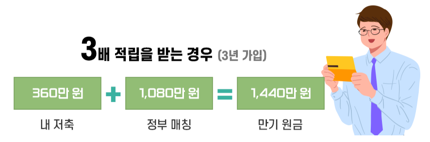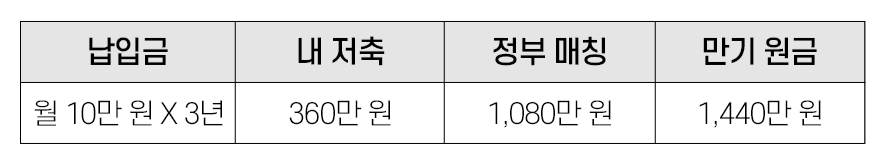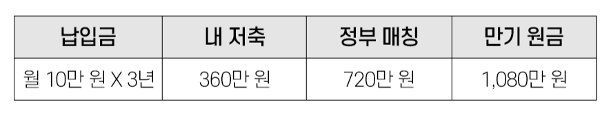 내가 10만 원 넣으면 정부에서 20만 원을 넣어줘요. 매월 총 30만 원이 쌓이죠. 3년 후에는 1,080만 원이 돼요. 나는 360만 원을 저축했는데 만기 때는 3배가 되는 돈을 받게 되는 거죠.