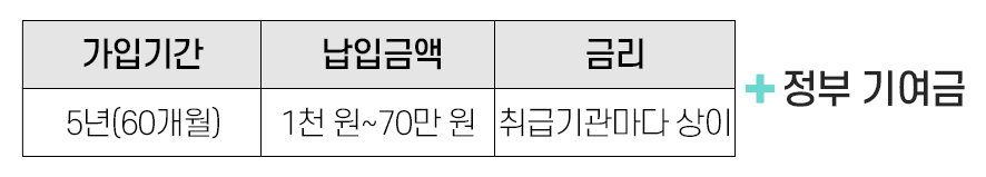 19~34세의 소득 6,000만 원 이하의 청년이라면 5년간 월 최대 70만 원까지 넣을 수 있습니다.
