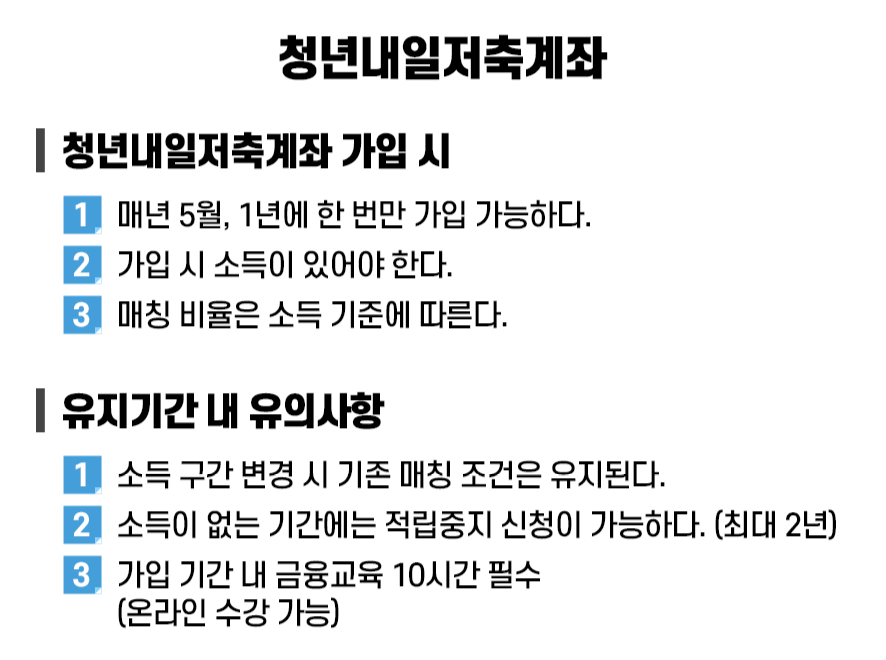 혜택이 많은 만큼 몇 가지 주의 사항이 있습니다. 청년내일저축계좌는 매년 5월에만 신청을 받습니다. 따라서 1년에 가입 할 수 있는 기회가 한 번만 주어지니 신청 기간을 놓치면 다음 해까지 기다려야 합니다.