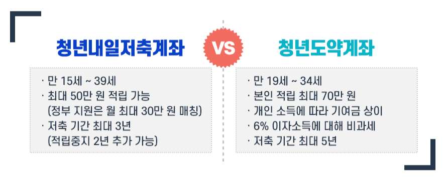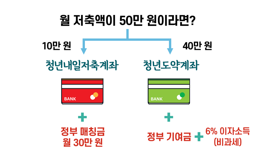만약 월 50만 원을 저축할 수 있는 여력이 있다면, 청년내일저축계좌와 청년도약계좌는 동시에 가입이 가능하니 청년내일저축계좌에 10만 원, 청년도약계좌에 40만 원을 넣어 혜택을 최대화하는 계획을 세울 수 있습니다.