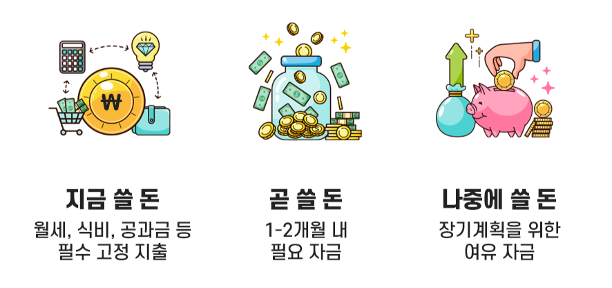 두 번째는 '곧 쓸 돈'이에요. 당장 이달에 쓸 돈은 아니지만, 친구들과 여행을 가기로 했다거나, 취업을 위한 정장 구입 등 1~3개월 안에 필요한 비용이 있다면, 고정 소득 일부를 매월 10만 원씩 별도의 계좌로 미리 옮겨서 미래 소비를 위해 준비해 두세요. 그러면 나중에 써야 할 돈이 한 번에 나가기 좀 큰돈이라도 부담 없이 필요한 곳에 사용할 수 있어요.