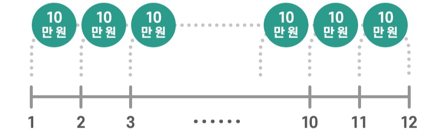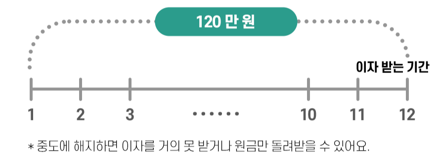 적금은 매월 일정 금액을 조금씩 넣는 방식이에요. 120만 원을 넣어도 정기예금처럼 모든 돈이 12개월 동안 이자를 받는 게 아닙니다.