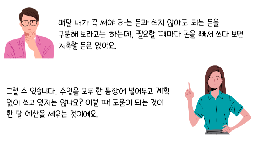 한 달을 기준으로 나의 수입 계획과 지출 계획을 잘 관리하고 5년 후 이렇게 모은 돈을 어떻게 쓸 것이라는 계획이 있다면 이런 의사결정을 내리는데 수월하겠죠?